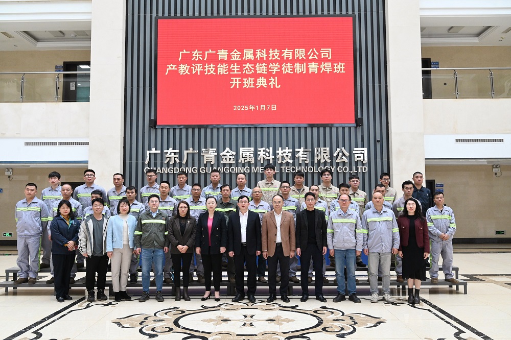 1月7日,由阳江市人力资源和社会保障局主办、广东广青金属科技有限公司与阳江市中乌巴顿职业培训学校联合举办的产教评技能生态链学徒制青焊班在公司四楼礼堂开班。市人力资源和社会保障局党组成员、副局长车代表,公司党委副书记、工会主席王大庆,中乌巴顿职业培训学校校长任香会,市、区人社局、链员企业有关负责人、企业导师及焊工班学员约40余人参加开班典礼。